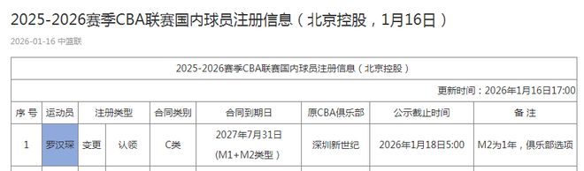 北京时间1月16日,CBA官方公布最新的国内球员注册信息,北控男篮与罗汉琛签约2年C类合同,其中第二年为俱乐部选项,北控男篮将成为罗汉琛效力的第3支球队,也将开启第14个赛季。