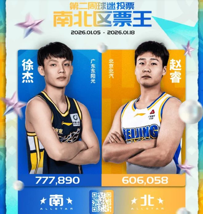 刚刚,CBA正式公布2026全明星投票第二周结果,从票数来看,广东队后场悍将徐杰,继续成为了南区的票王,同时,他依然是CBA全明星赛的总票王。北京队的后场悍将赵睿,则成为北区的票王。