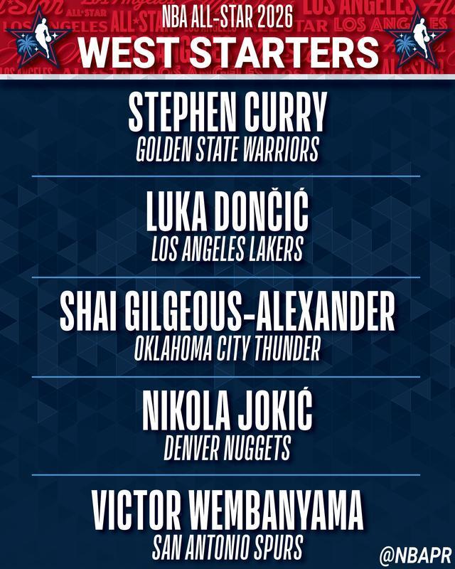 西部:卢卡-东契奇(湖人)、斯蒂芬-库里(勇士)、谢伊-吉尔杰斯-亚历山大(雷霆)、尼古拉-约基奇(掘金)和维克托-文班亚马(马刺)。