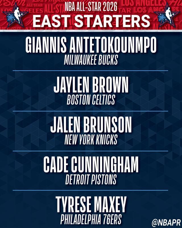 东部:扬尼斯-安特托昆博(雄鹿)、杰伦-布朗(凯尔特人)、杰伦-布伦森(尼克斯)、凯德-坎宁安(活塞)和泰雷塞-马克西(76人)。