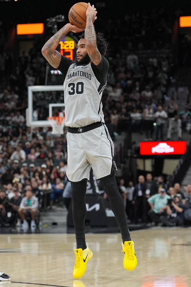 马刺的人员配置进攻档次差距不大,人人都能突投结合,单节利用文班亚马的牵制力交出13中8的三分命中率,特别是尚帕尼首节爆砍15分,显得特别亮眼。