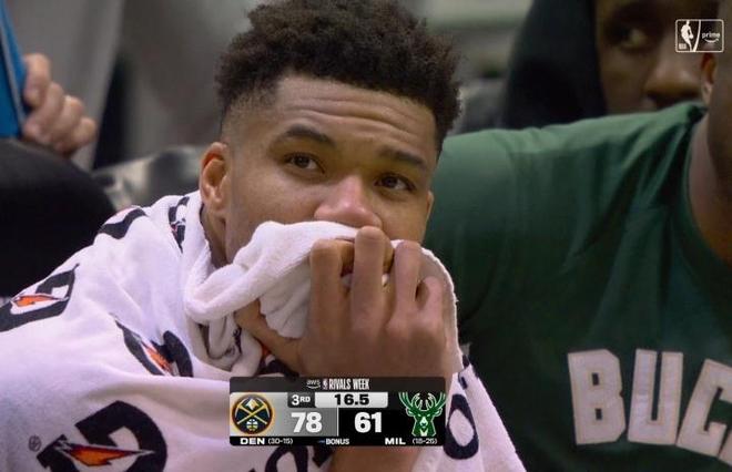 然后比赛最后时刻,字母哥受伤了,结果坐在板凳席上的他拿毛巾捂着脸,非常的痛苦和沮丧,看着好像球队输球导致他很难受一样。可实际上他难受并不是因为球队输了,而是因为他自己受伤了,很可能交易不掉了,这才是字母哥满脸不爽的真正原因。
