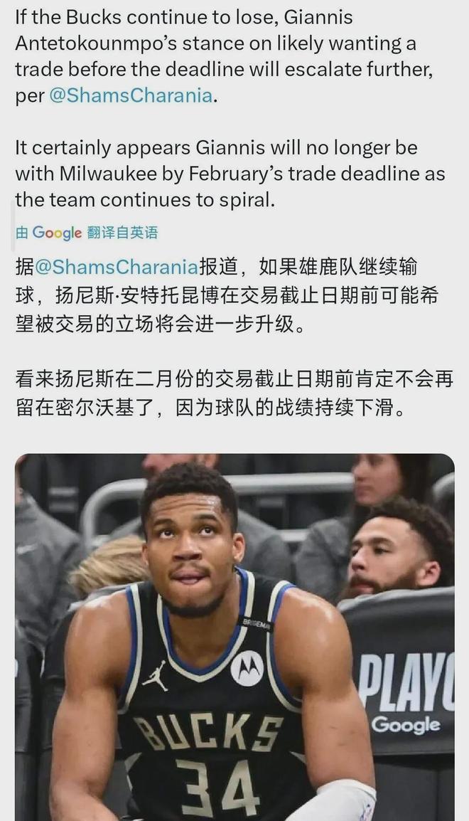 爆料王Shams对此表示:字母哥离开雄鹿已成定局,悬念只有何时&何种方式提桶跑路。