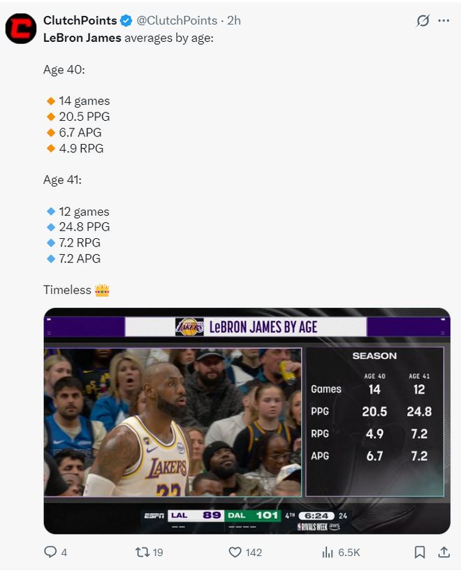 转播方也还出,詹姆斯40岁的14场比赛场均20.5分6.7篮板4.9助攻,但41岁的12场比赛场均24.8分7.2篮板7.2助攻,老詹还在进步。