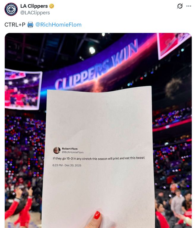 开局快船陷入困境时,一名网友曾公开表示如果本赛季快船任何阶段打出15胜3负表现,自己将打印这条推文并吃掉。
