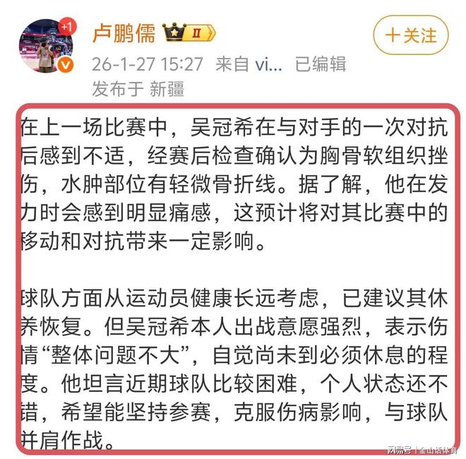 值得一提的是,本场比赛,新疆队内线悍将吴冠希,带伤上场表现出色。据媒体人卢鹏儒赛前报道,吴冠希在上场对阵辽宁队的比赛中受伤,经医院检查确认为肋骨骨裂。球队管理层和教练组,从球员的健康角度考虑,建议他此役休战,但吴冠希表示球队目前比较困难,自己感觉“问题不大”,主动请缨上场参赛,这也令全队上下非常感动。