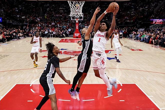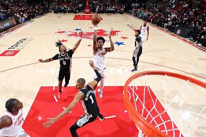本场比赛中,火箭的先发控卫阿门-汤普森(Amen Thompson)算是将自己的弱点暴露无遗。阿门全场出场35分52秒,投篮23中11,罚球3中3,得到了25分7篮板4助攻4抢断1盖帽的数据,还有2次失误,正负值为-15。阿门在进攻端看起来还是展现出了不错的突破能力,他也是通过这样的方式得到了不少的分数。不仅如此,阿门在防守端的表现也是值得肯定的,他也是展现出了自己在这方面的特点。然而问题就在于,到了比赛第四节,马刺调整了对于阿门的防守布置,阿门的突破成功率下降,他在中距离投篮方面毫无准星,他又没有足够的传球能力和组织能力,球队的进攻陷入了彻底的停滞,这也是球队最终遭遇了一场惨败的关键因素。