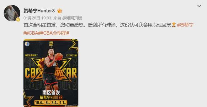 对了,贺希宁今年还生涯首次入选全明星首发,球迷用投票证明了他本赛季的发挥的确无比亮眼。