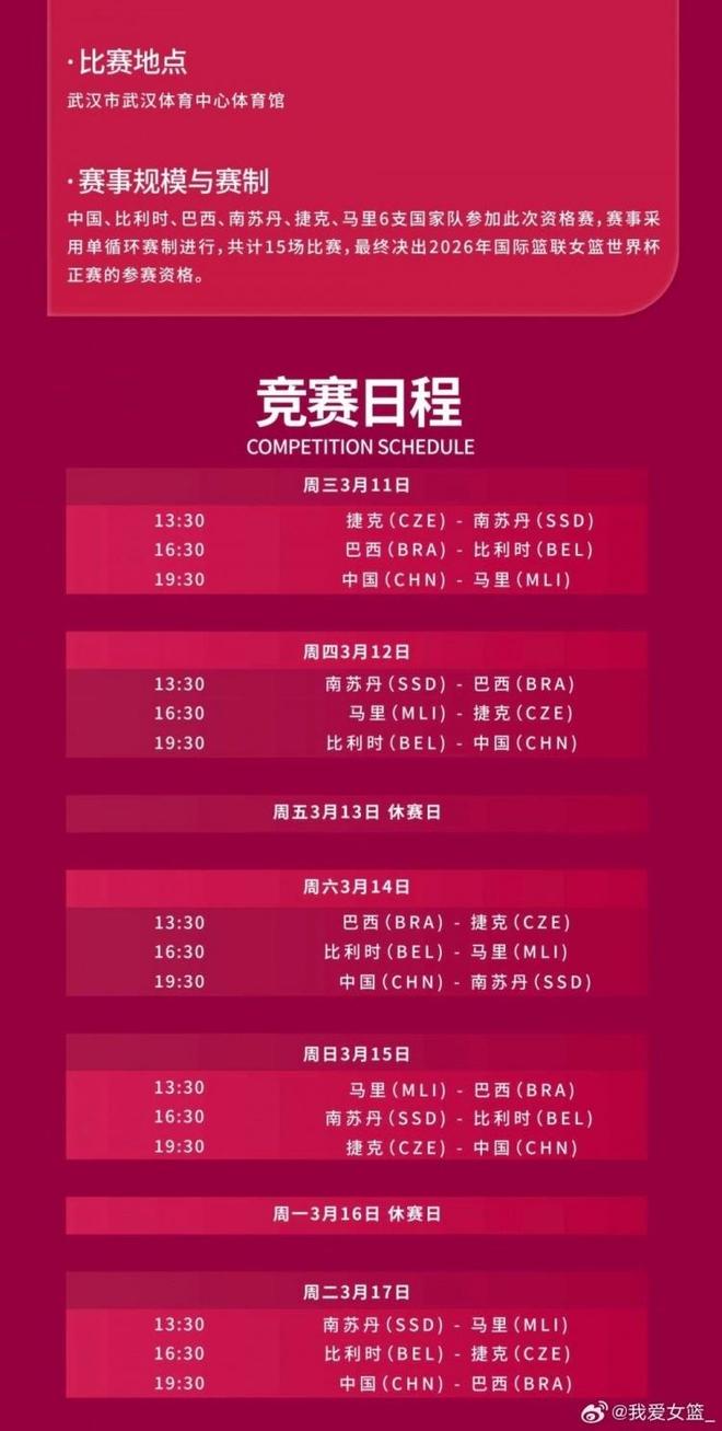 中国女篮将坐镇主场在武汉参加世预赛,如今武汉赛区公布具体竞赛日程。中国女篮将从3月11日到17日,7天之内先后对阵马里女篮、比利时女篮、南苏丹女篮、捷克女篮和巴西女篮。