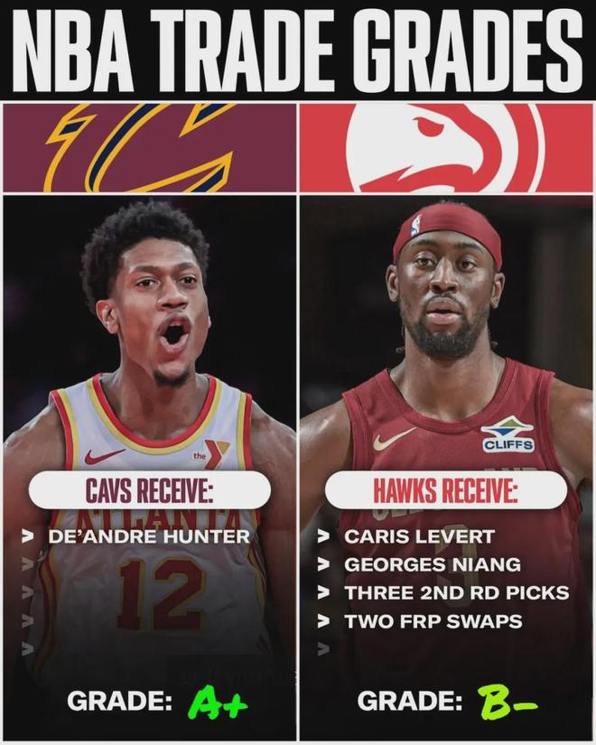 目前骑士29胜21负,仅排东部第五。上赛季骑士64胜18负,高居东部第一和联盟第二。骑士当初是怎么得到亨特的?2025年2月,骑士送出勒维尔、尼昂、3个次轮签和2个次轮互换权,从老鹰换来亨特。在骑士只打了一年,亨特又被交易了。