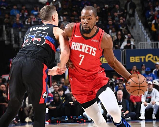 火箭去年休赛期从太阳换来杜兰特后,目前以29胜17负的战绩稳居西部第四的位置。这份成绩单相当不错了。因为这是在核心球员范乔丹和亚当斯赛季报销的情况下。杜兰特几乎以单核带队的姿态,扛起了球队的进攻大旗,他的表现无可挑剔,在攻防两端都是这样。截至目前,37岁杜兰特在本赛季为火箭出战44场,全部首发,场均上场36.8分钟,贡献26.5分5.4篮板4.5助攻,投篮命中率高达51.4%,三分命中率达到40.8%,罚球命中率88.6%。