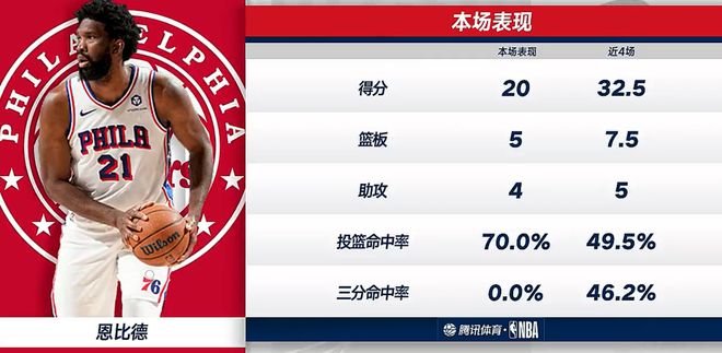 末节打了4分钟恩比德就1个出手没拿分,随后的6分钟里恩比德4中2+罚球1中1拿到5分1助攻,决胜时刻球权几乎都在马克西手中,球很难再度打到恩比德手中,最终恩比德未能力挽狂澜再度帮助费城反超。