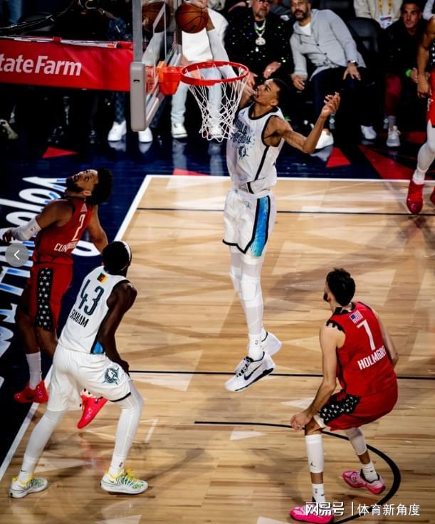 首战世界队迎战新生队,文班亚马从跳球的那一刻起,就如同一位身披战甲的勇士,眼中闪烁着对胜利的渴望。他在攻防两端不遗余力,每一次盖帽都如同惊雷,每一次突破都势不可挡。看到文班如此拼尽全力,华子(爱德华兹)也被点燃了斗志,仿佛常规赛中与文班交锋时的那种“鸡血”状态再次附体。全明星舞台上,华子不再有所保留,他迎着文班的挑战,一记绝平三分划破长空,让全场沸腾。首战文班贡献14分6篮板3盖帽的全面数据,而华子则以13分回应,其中包括那记令人难忘的绝平三分。