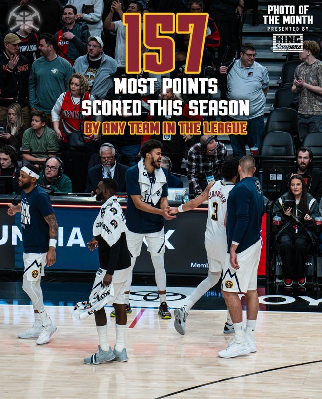 掘金157-103狂胜开拓者,这场比赛掘金赢球后与湖人的胜场差还有0.5场,此役掘金单场157分创造队史单场新高,净胜分54分也是队史单场新高,背靠背净胜54分是NBA历史新高。这场比赛约基奇32+9+7+4断三节打卡。