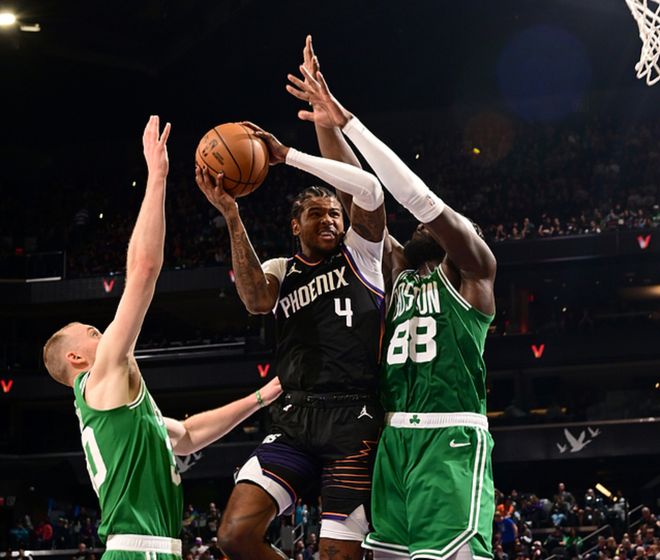 太阳主场迎战凯尔特人,太阳少了布克、狄龙、古德温,凯尔特人少了布朗、塔图姆,太阳首节取得5分领先,第二节、第三节凯尔特人优势巨大,三节战罢凯尔特人领先23分,第四节太阳追回7分,最终凯尔特人97-81大胜太阳。怀特18中9(三分11中4)得到22分8板8助,克塔10中5得到14分13板3助2帽,太阳方面杰伦格林18中5得到13分4板,吉莱斯皮11中6(三分6中3)得到15分3板3助。