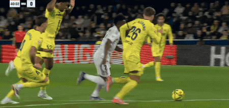第40分钟,皇马前场积极逼抢,贝林厄姆断球,维尼修斯的斜射稍稍偏出。