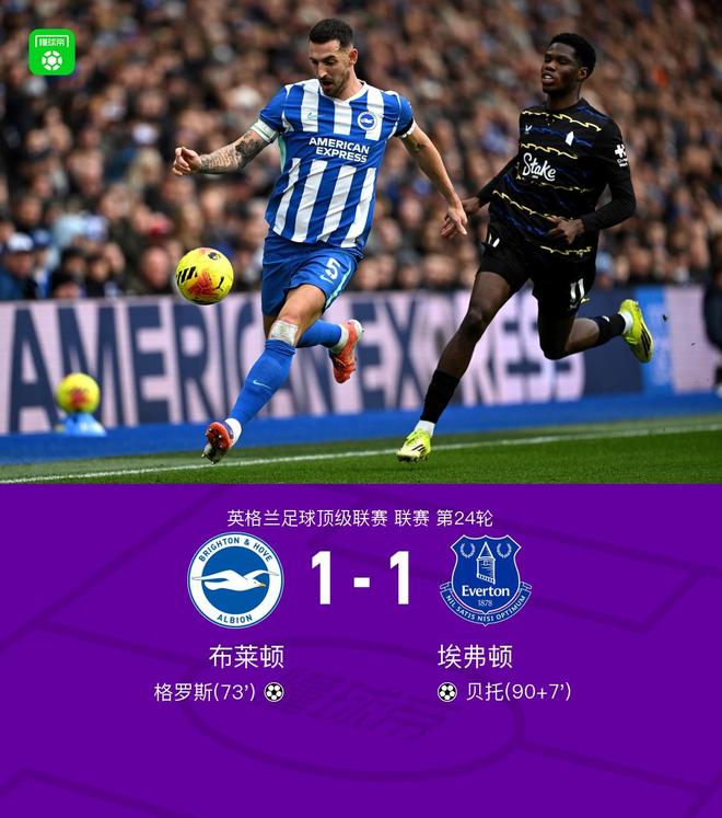 布莱顿1-1埃弗顿,贝托读秒绝平,格罗斯破门