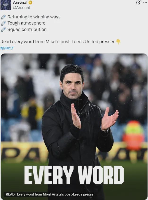阿尔特塔出席了赛后新闻发布会,我们来看阿森纳主帅的发言。