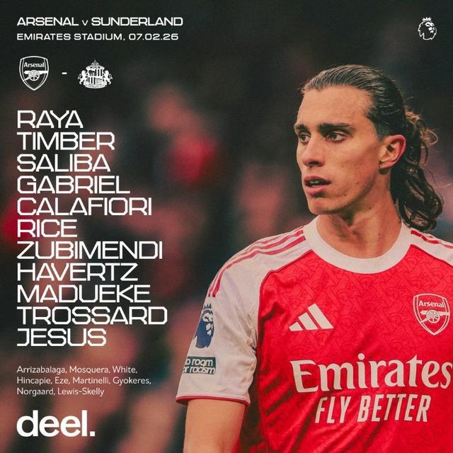 阿森纳首发:1-拉亚、12-廷贝尔、2-萨利巴、6-加布里埃尔、33-卡拉菲奥里、41-赖斯、36-苏比门迪、29-哈弗茨、20-马杜埃凯、19-特罗萨德、9-热苏斯