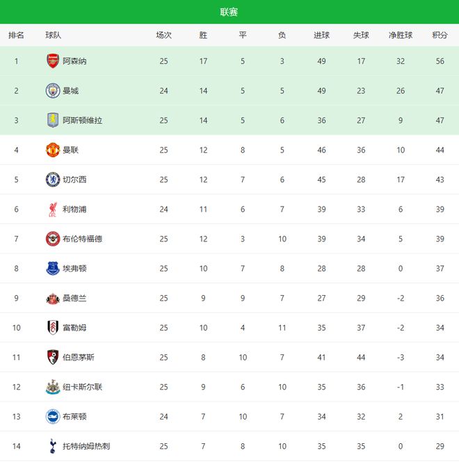 北京时间2月8日凌晨,英超第25轮如期进行,排在积分榜前五的多家豪门联手出击,领头羊阿森纳主场3-0桑德兰,以9分的优势领跑联赛;切尔西客场3-1副班长狼队,帕尔默半场上演帽子戏法,成为队史第一人;维拉大爆冷门客场0-1不敌伯恩茅斯队;曼联主场2-0完胜热刺,卡里克带队豪取4连胜,稳居积分榜第四;其他比赛,伯恩利主场0-2不敌西汉姆联;埃弗顿客场2-1击败富勒姆;纽卡斯尔联主场2-3输给了布伦特福德,真的是几家欢喜几家愁啊!