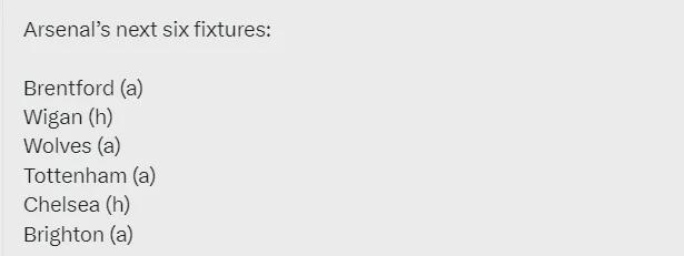 阿森纳未来6场比赛:客战布伦特福德、主战维冈、客战狼队、客战热刺、主战切尔西、客战布莱顿。