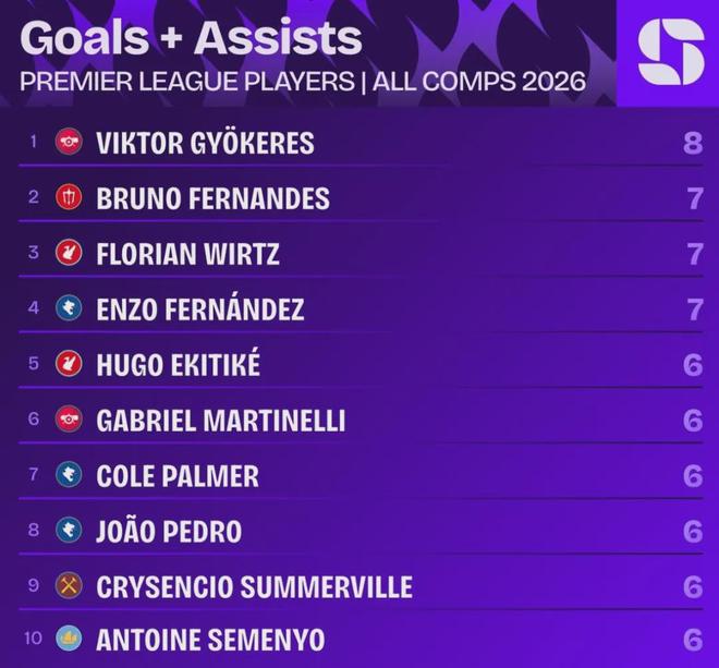自2026年以来,哲凯赖什已经在各项赛事贡献6球2助攻,是同期所有英超球员中各项赛事参与进球数最多的(曼城和利物浦比赛开打前)。