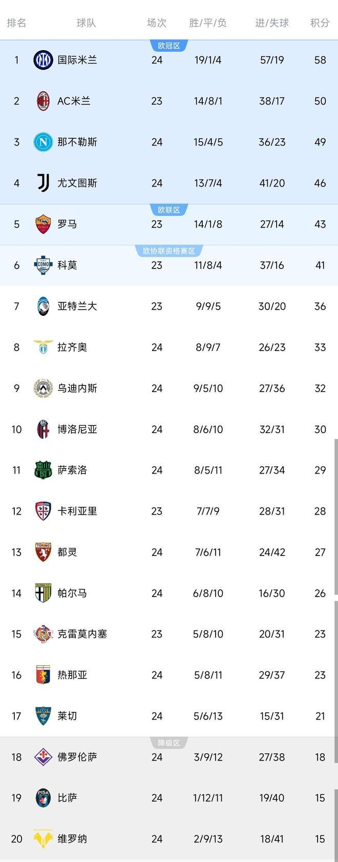 本轮战罢,意甲积分榜的形势进一步明朗,国际米兰以58分继续强势领跑,对第二名AC米兰的领先优势扩大到了8分,那不勒斯积49分排名第三,惊险战平的尤文图斯积46分,暂列第四,但仅领先身后的罗马3分,欧冠资格的争夺依然充满变数。