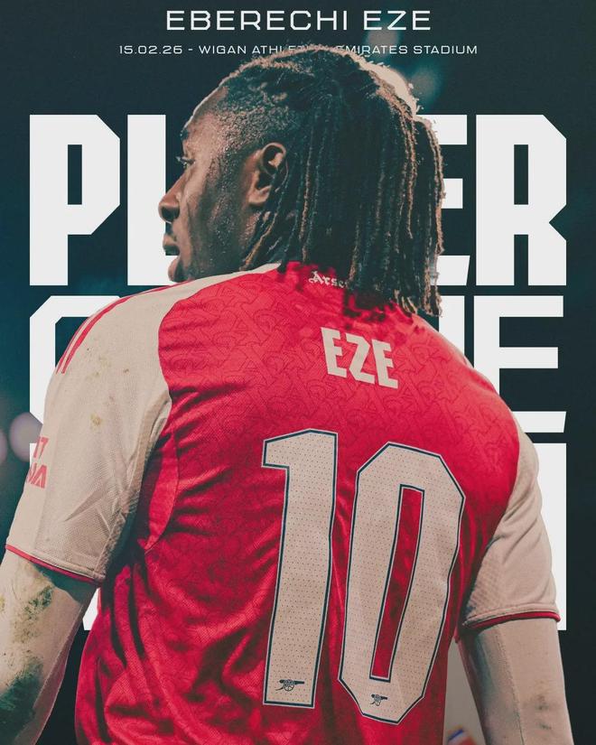 埃泽被阿森纳官方评选为了全场比赛最佳球员!